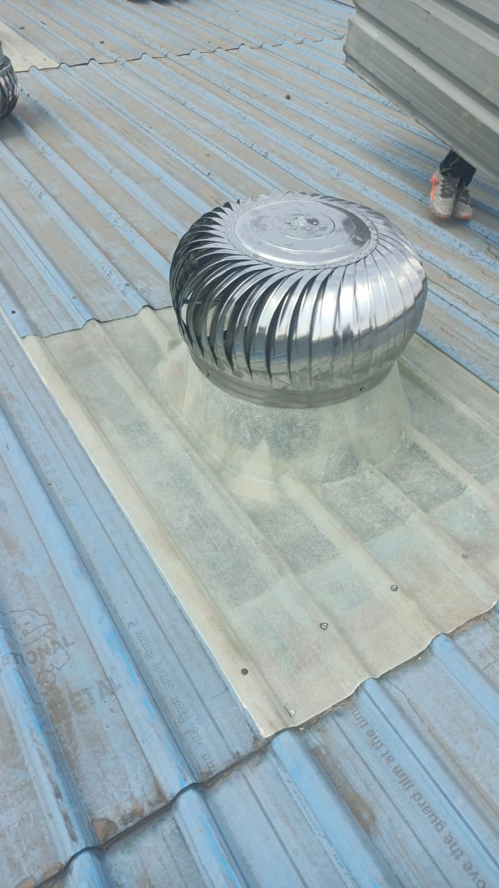 Natural roof air ventilators mounted on custom FRP bases to exhaust hot, stale air from sheds and factories without electricity.