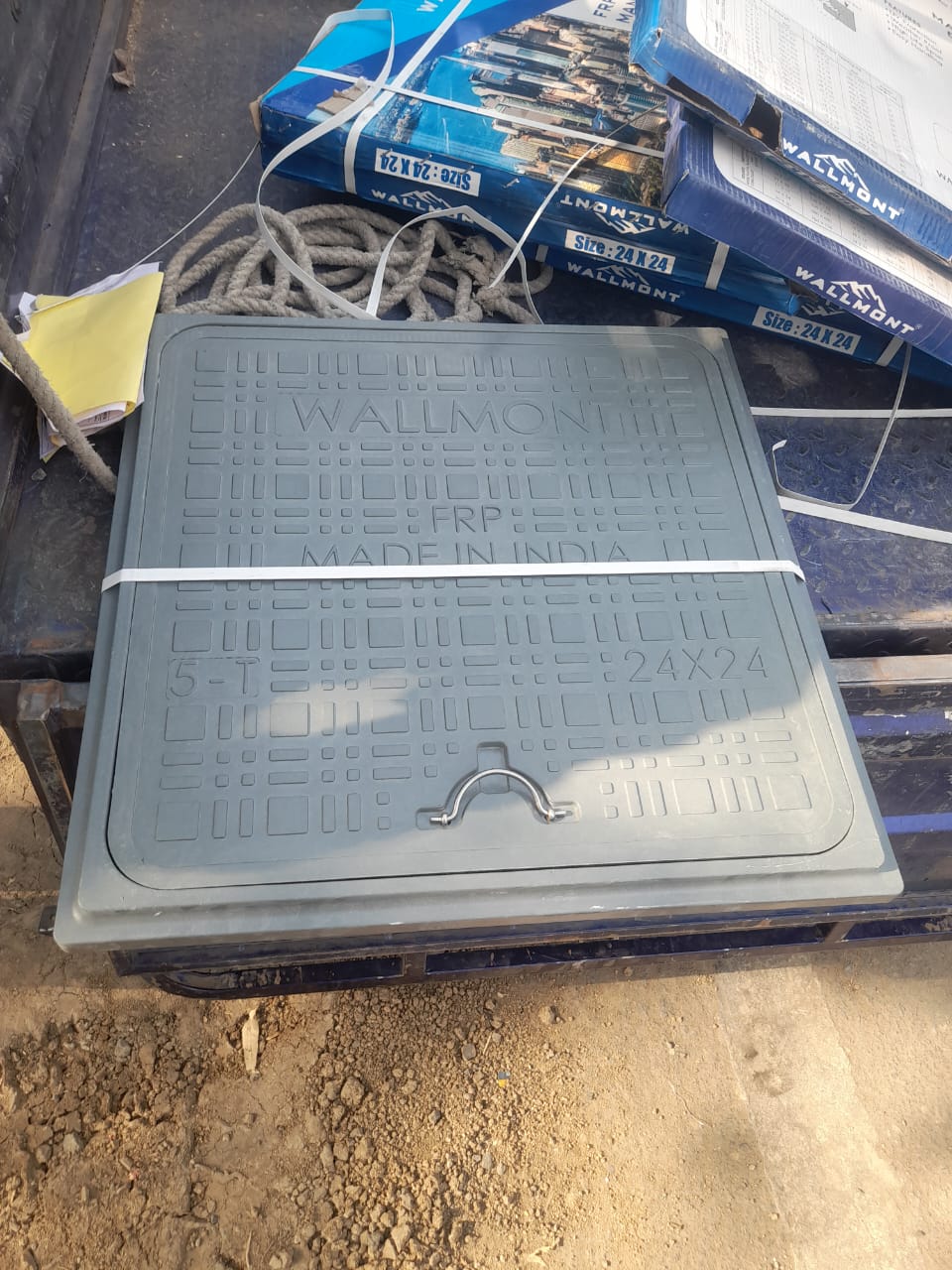 Heavy-duty FRP manhole covers with frames for roads, footpaths, and industrial areas. Corrosion-resistant, lightweight, and available in standard sizes including 24×24 with load ratings.